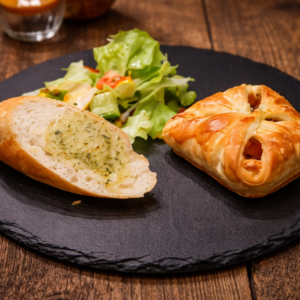 - Das Pilz-Paprika-Gemüse gleichmäßig auf den Platten verteilen. Den Schafskäse würfeln und auf das Gemüse geben. Bei jeder Blätterteigtasche alle vier Ecken in der Mitte zusammendrücken und die Taschen so schließen.Das Eigelb mit etwas Milch verquirlen und die Teigtaschen damit bestreichen.